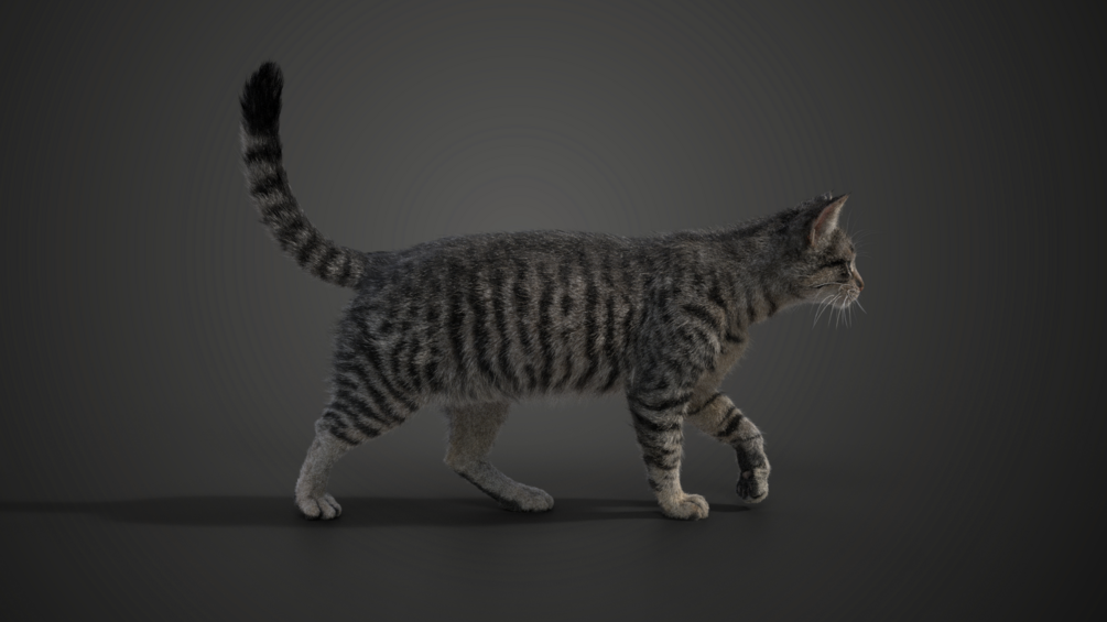 This is a high-quality grey tabby cat model with 4K maps, hair, rigging and animations. The maps are in the UDIM format, and the skin and the hair textures are made separately. Besides, there is a separate high-detailed oral cavity model. The model is made with Blender and Cycles renderer at real-world scale.
